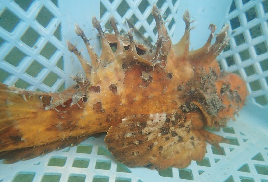 | 説明1 | 刺し網で漁獲されたオニオコゼです。あまりまとまって漁獲される魚ではありませんが、このところ、安定して漁獲されています。から揚げがおすすめです。 |