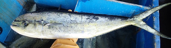 | 説明5 | 定置網で漁獲された尾叉長60cmのシイラです。春以降、県内で漁獲が継続しています。フライやムニエルがおすすめです。 |