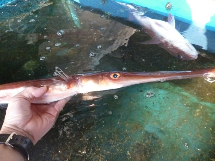 | 説明3 | 定置網で漁獲されたアカヤガラです。漁獲量が少なく、細長く頭部が長い特徴的な形なので流通には乗りにくい魚ですが、上品な白身の身質で隠れた逸品です。刺身、煮付け、ねり物などどんな料理にもあいます。 |