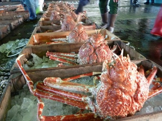 | 説明3 | 底びき網で漁獲されたタカアシガニです。この日は珍しく20尾以上のタカアシガニが水揚げされました。漁獲後すぐのカニは身も詰まって美味しくいただけます。世界一の大きさのカニで調理が難しいですが、足を折って蒸したり焼いたりして食されます。 |