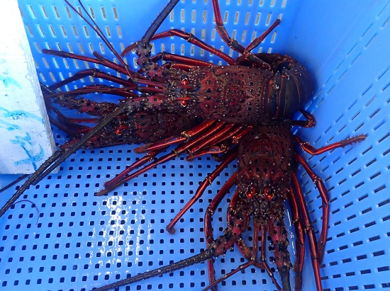 | 説明4 | 刺し網で漁獲されたイセエビです。県の魚であり、県内の漁獲量は全国トップクラスです。色や姿が良く、この時期は特に重要な水産物です。刺身やソテーがおすすめです。 |