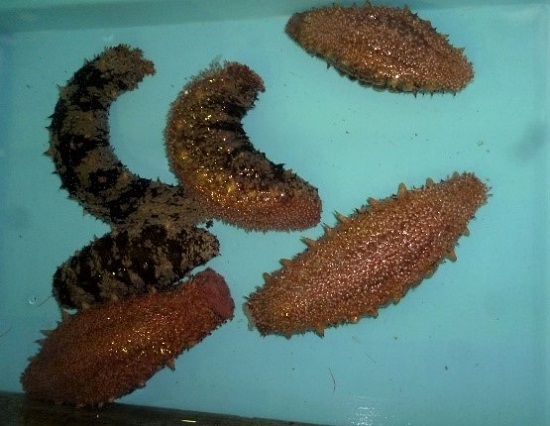 | 説明1 | ひし突き漁法(船の上から網やカギを用いて漁獲する漁法)で漁獲されたマナマコです。アカ・アオ・クロの3色のマナマコがいますが、尾鷲ではアカナマコだけが水揚げされます。マナマコは冬の味覚ですが、今年は水温の下がりが遅く、最近になってやっと水揚げが始まりました。薄く切って酢の物で食されます。 |