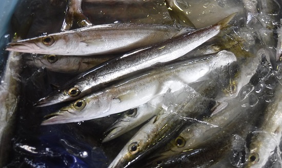 | 説明1 | 定置網で漁獲されたアカカマスです。初夏と秋に漁獲のピークが見られます。この時期のアカカマスは特に脂が乗っており、塩焼き、酢締め、寿司がおすすめです。 |