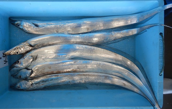 | 説明3 | 一本釣りで漁獲されたタチウオです。釣りのタチウオは体表の銀色がしっかり残っていて、見た目もきれいです。この日はまとまった漁獲が見られました。写真のような大型のものは刺し身や塩焼きがおすすめです。小型のものはみりん干しなどに加工されて販売されます。 |