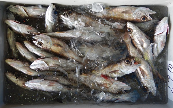 | 説明4 | 定置網で漁獲されたクサヤモロです。伊豆諸島の珍味「くさや」の原料として有名です。脂はあまり乗らない種ですが、みりん干しなどに加工するとおいしく食べられます。 |