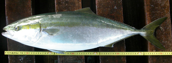 | 特徴 | 上顎の上後角が角張る。胸鰭は腹鰭と同じ長さ。黄色縦帯は胸鰭の付け根を通らない。稜鱗(りょうりん 鋭い棘を持つ大きな鱗。ぜんご、ぜいごとも呼ぶ)がない。 |