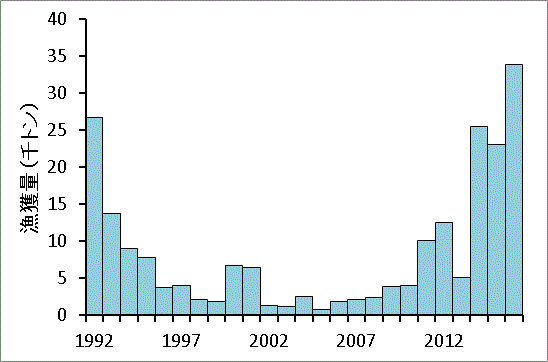 | 年別漁獲量1 | 中型まき網の漁獲は1990年代になって急減し、1996年以降15年間はほぼ5千トン以下の低水準となったが、2011年以降増加傾向が続いている。近年の漁獲物は、1980年代の高水準期にみられた春季の産卵後の大羽群とは異なっている。 |