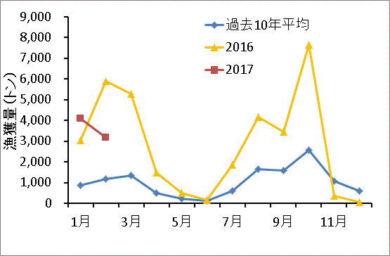 | 近年の月別漁獲量 | 漁獲主体は夏秋季の0歳魚で、2015年以降は冬春季の産卵群もまとまって漁獲されるようになっている。2017年1〜3月は前年並の好漁で、漁獲主体は14cm前後の1歳魚と、19.5p前後の2歳および3歳魚であった。 |