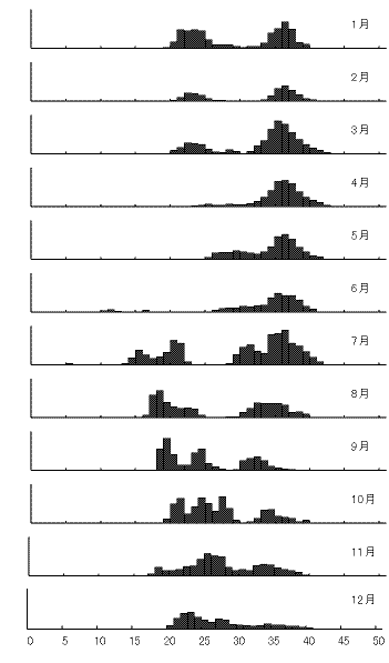 | 来遊時期と魚体 | まき網による漁獲物の体長組成。夏から秋は尾叉長30cm未満の未成魚が主体で、それらの群れは熊野灘に比較的長期間滞留する。冬から春は32〜40cm程度の成魚が来遊する。 |