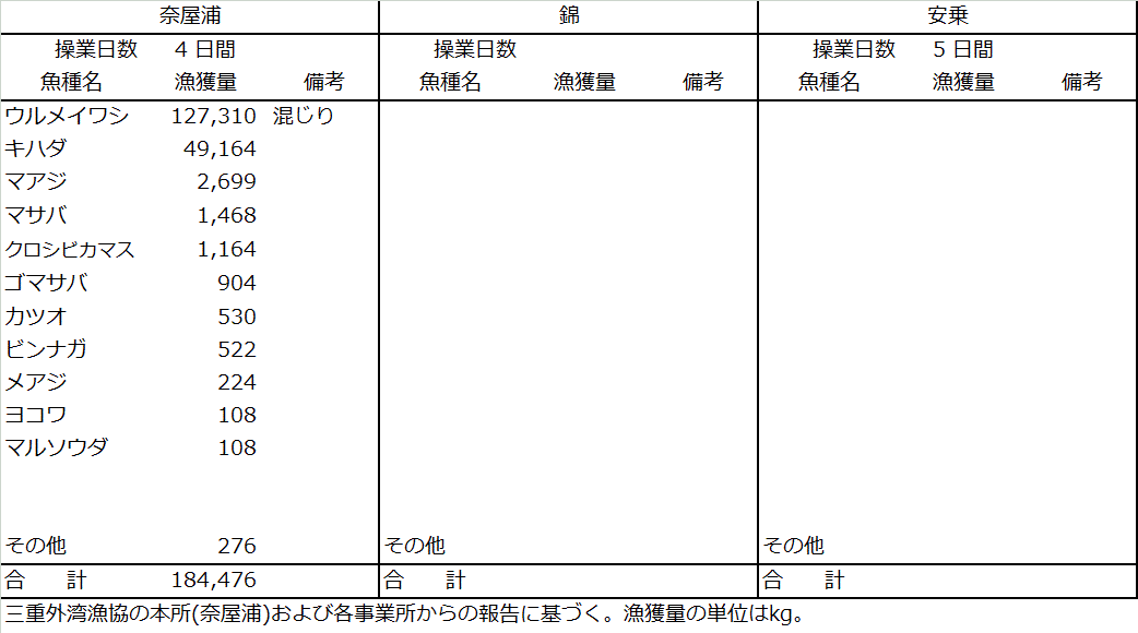 | 中型まき網 | ウルメイワシ127t、キハダ49t、マアジ2.7t、マサバ1.5t、クロシビカマス1.2t |