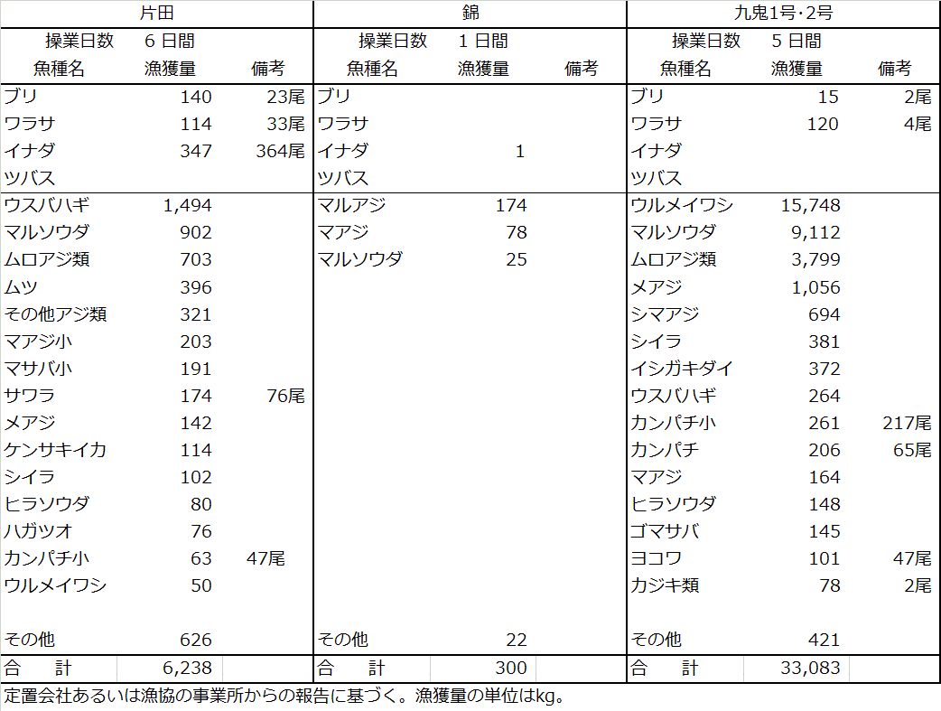 | 大型定置網 | イワシ類16t、マルソウダ10t、ムロアジ類4.5t、ウスバハギ1.8t、メアジ1.2t |