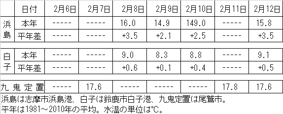 | 熊野灘周辺の概況 | 黒潮蛇行北上部の屈曲部が大王埼の東沖にあり、熊野灘の沖合には黒潮系の暖水が東から波及している。浮魚礁#2は西寄りに振られ、水温は18℃半ばを観測している。早田定置ブイでは18℃半ば、片田定置ブイでは18℃前後の水温を観測している。 |