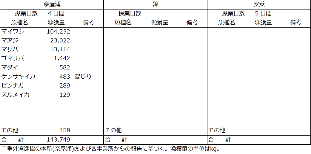 | 中型まき網 | マイワシ104t、マアジ23t、マサバ13t、ゴマサバ1.4t、マダイ0.6t |