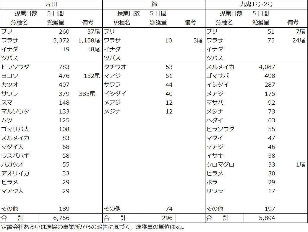 | 大型定置網 | スルメイカ4.2t、ワラサ3.5t、ヒラソウダ0.8t、サバ類0.7t、ヨコワ0.5t |