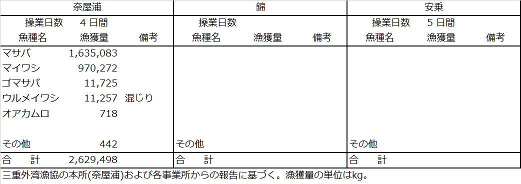 | 中型まき網 | マサバ1635t、マイワシ970t、ゴマサバ12t、ウルメイワシ11t、オアカムロ0.7t |