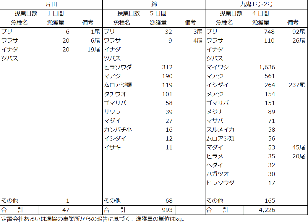 | 大型定置網 | イワシ類1.6t、ブリ0.8t、マアジ0.8t、ヒラソウダ0.3t、サバ類0.3t |