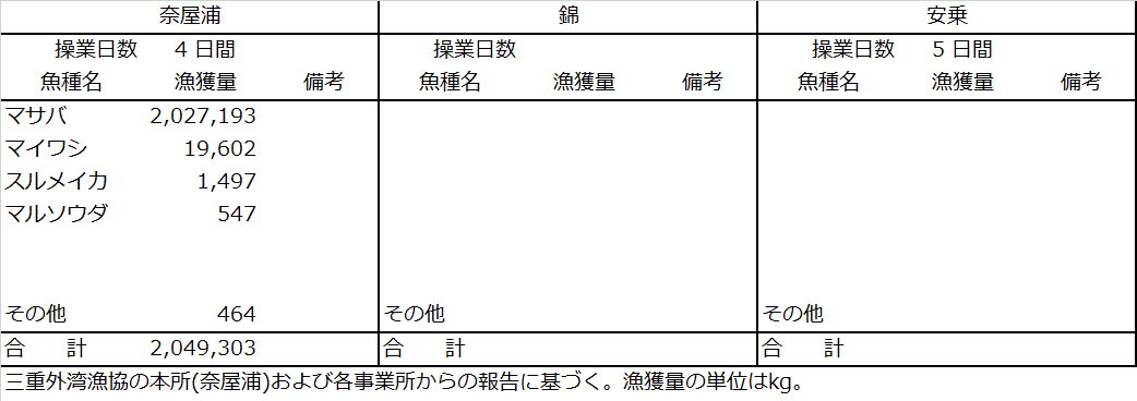 | 中型まき網 | マサバ2027t、マイワシ20t、スルメイカ1.5t、マルソウダ0.5t |