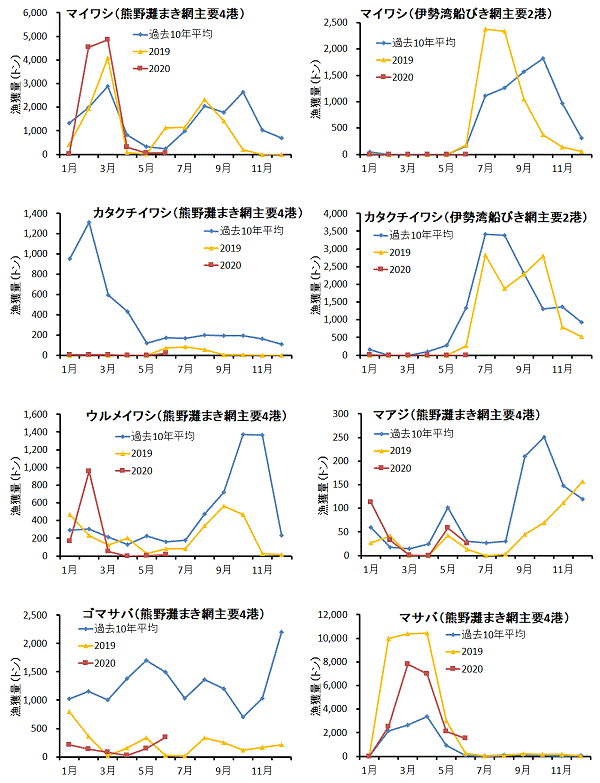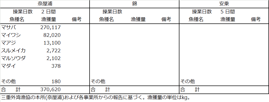| 中型まき網 | マサバ270t、マイワシ82t、マアジ13t、スルメイカ2.7t、マルソウダ2.1t |