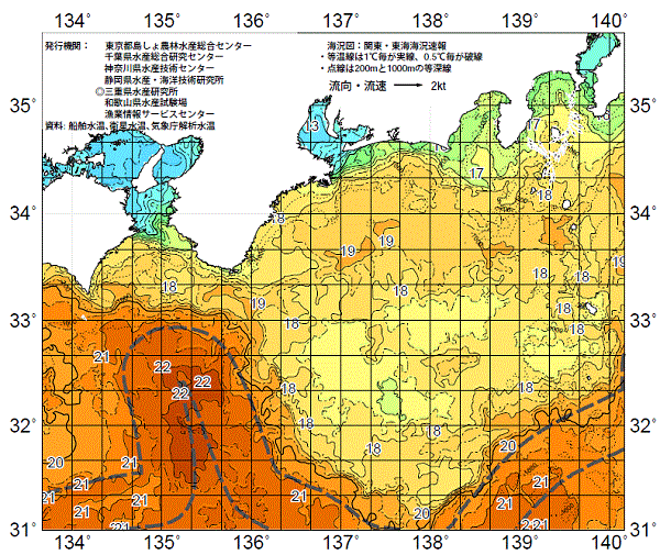 | 熊野灘周辺の概況 | 四国沖の小蛇行が東進し、紀伊水道南沖で黒潮が北に突出している。また、黒潮系暖水が遠州灘沖にあり、熊野灘に波及している。熊野灘浮魚礁#2は北西に振られ、水温は17台半ばから約1℃上昇して18℃台半ば。伊勢湾口沖に顕著な潮境が形成されている。。 |