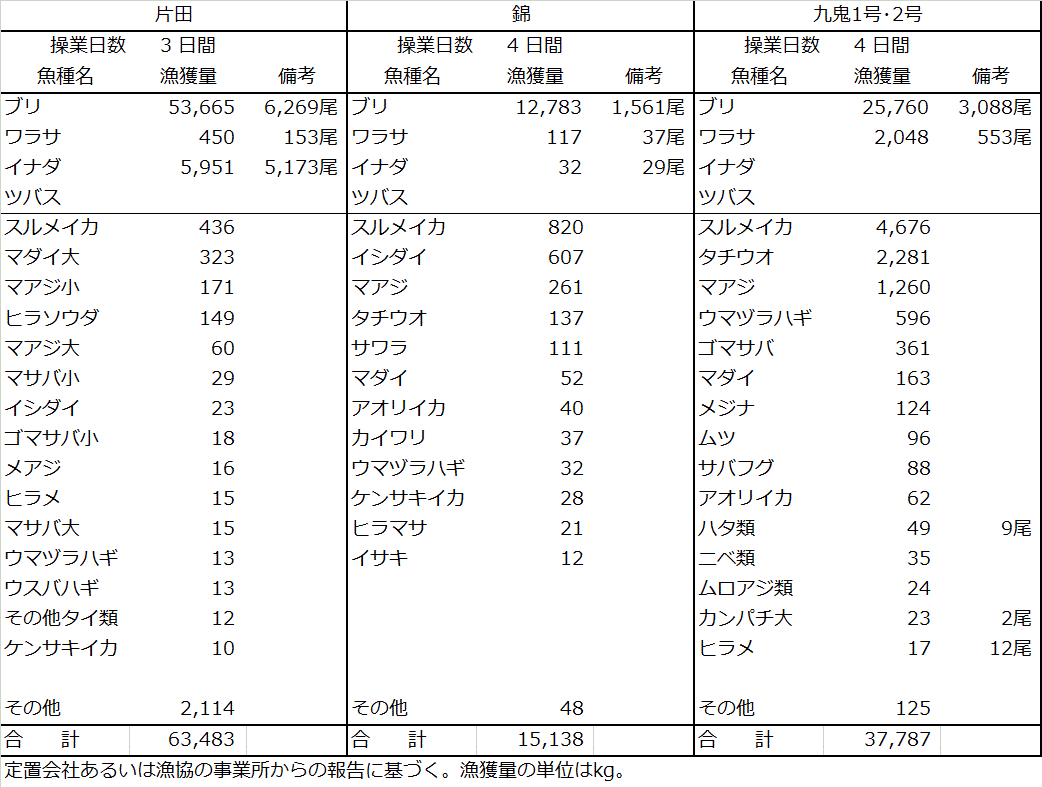| 大型定置網 | ブリ92t、イナダ6.0t、スルメイカ5.9t、ワラサ2.6t、タチウオ2.4t |