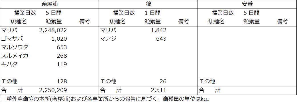 | 中型まき網 | マサバ2250t、ゴマサバ1.0t、マルソウダ0.7t、マアジ0.6t、スルメイカ0.3t |