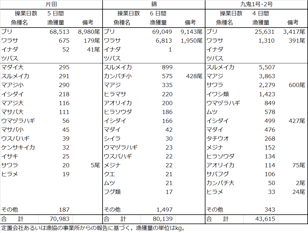 | 大型定置網 | ブリ163t、ワラサ8.8t、スルメイカ6.7t、マアジ4.6t、サワラ2.3t |