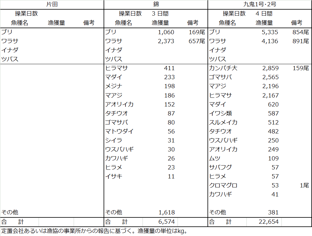 | 大型定置網 | ワラサ6.5t、ブリ6.4t、カンパチ2.9t、サバ類2.6t、ヒラマサ2.6t |