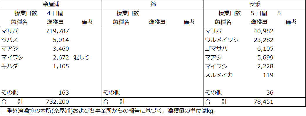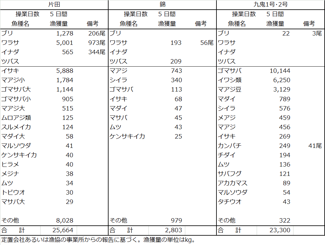 | 中型まき網 | マサバ761t、ウルメイワシ23t、マアジ9.2t、ゴマサバ6.1t、ツバス5.0t |