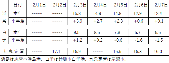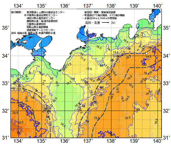 | 熊野灘周辺の概況 | 黒潮の蛇行北上部が西偏し、熊野灘沿岸及び沖合へ黒潮系暖水が波及している。熊野灘沿岸の潮位偏差はやや上昇し、20cm前後高めで推移している。浮魚礁No.2は西寄りに振られ、水温は19℃台後半で推移している。 |