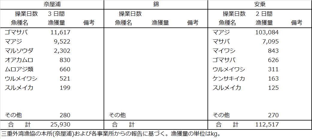 | 中型まき網 | マアジ113t、ゴマサバ12t、マサバ7.1t、マルソウダ2.3t、マイワシ0.8t |