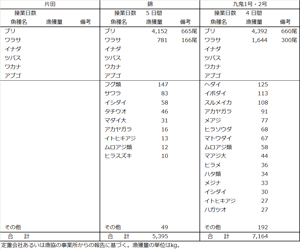 | 大型定置網 | ブリ8.5t、ワラサ2.4t、フグ類0.1t、ヘダイ0.1t、イボダイ0.1t |
