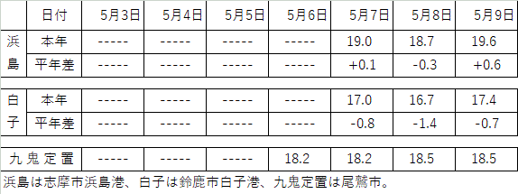 | 熊野灘周辺の概況 | 黒潮の蛇行北上部から熊野灘沿岸及び沖合への暖水波及は強くない。熊野灘沿岸の表面水温は、概ね平年並で推移している。定置ブイの水温は、阿田和では19℃台を、片田では17 ℃台を観測している。 |