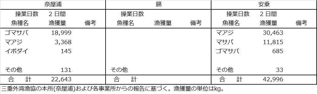 | 中型まき網 | マアジ34t、ゴマサバ20t、マサバ12t、イボダイ0.1t |