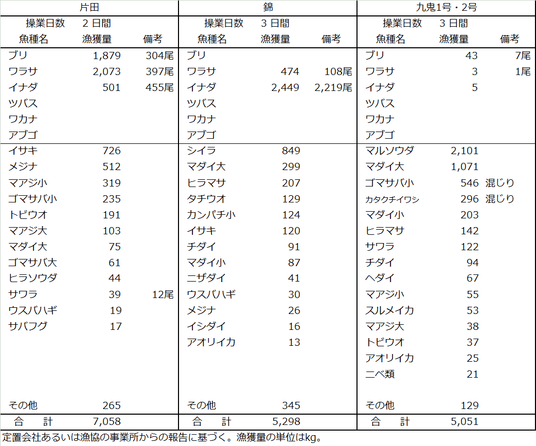 | 大型定置網 | イナダ3.0t、ワラサ2.6t、マルソウダ2.1t、ブリ1.9t、マダイ1.7t |