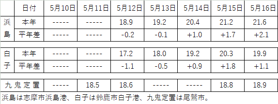 | 熊野灘周辺の概況 | 黒潮本流から熊野灘沿岸及び沖合へ暖水が波及している。熊野灘浮魚礁No.2は西北西寄りに振られ、水温は22℃前後を観測している。定置ブイの表面水温は、片田では18℃前後、早田、阿田和では20℃前後で推移している。 |