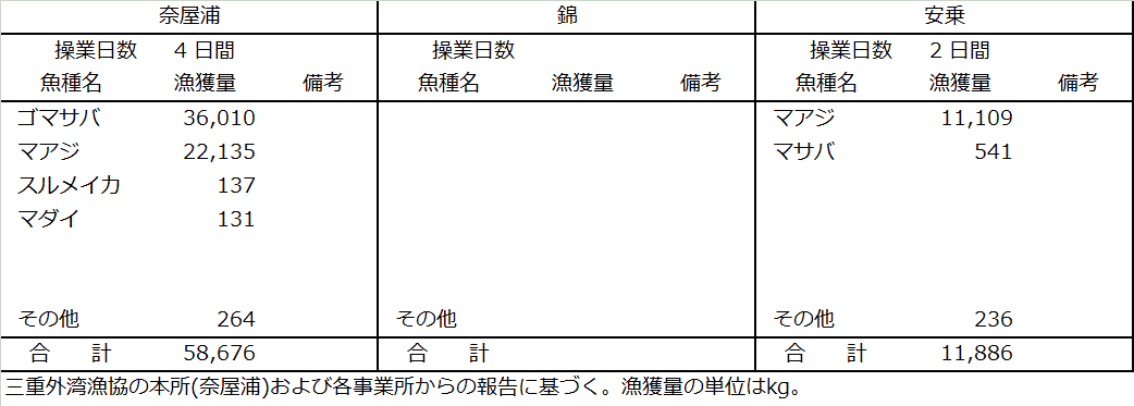 | 中型まき網 | ゴマサバ36t、マアジ33t、マサバ0.5t、スルメイカ0.1t、マダイ0.1t |