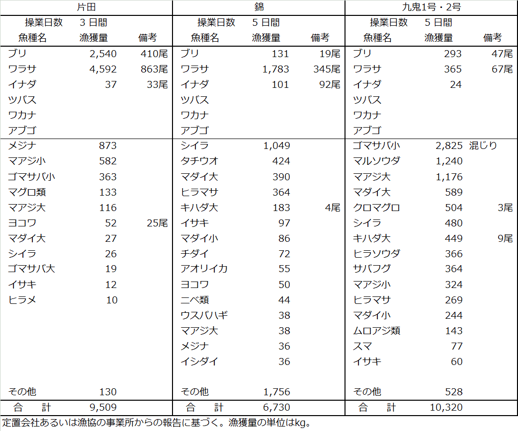 | 大型定置網 | ワラサ6.7t、サバ類3.2t、ブリ3.0t、マアジ2.2t、シイラ1.6t |
