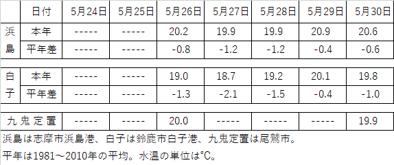 | 熊野灘周辺の概況 | 5月28〜29日に実施した調査船の観測によると、熊野灘沿岸及び沖合の表面水温はおおむね20〜22℃台で、平年よりやや高め〜高め、前年よりやや高めであった。浮魚礁No.2は南西方向へ振られ、水温は21℃台を観測している。 |
