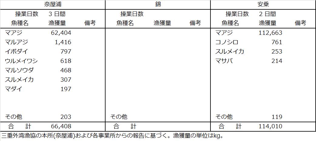 | 中型まき網 | マアジ175t、マルアジ1.4t、イボダイ0.8t、コノシロ0.8t、ウルメイワシ0.6t |