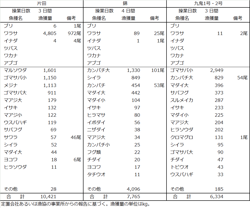| 大型定置網 | サバ類5.1t、ワラサ4.9t、カンパチ2.6t、マルソウダ1.6t、マダイ1.2t |