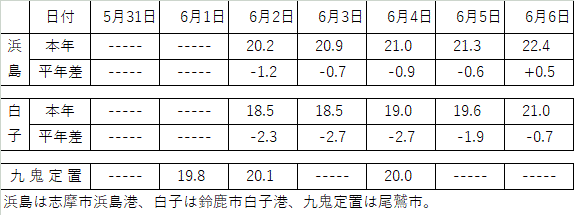 | 熊野灘周辺の概況 | 黒潮の蛇行北上部から熊野灘沖合へ黒潮系暖水が波及している。浮魚礁No.2の水温は22℃前後で推移し、南寄りに振られている。熊野灘沿岸の表面水温は、平年並で推移している。 |