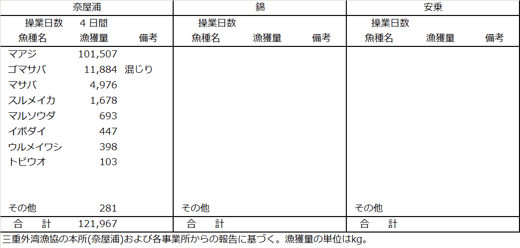 | 中型まき網 | マアジ102t、ゴマサバ12t、マサバ5.0t、スルメイカ1.7t、マルソウダ0.7t |