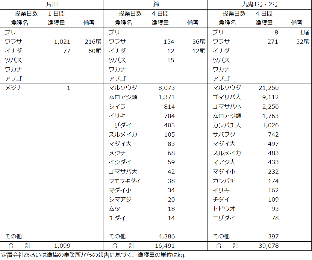 | 大型定置網 | マルソウダ29t、サバ類11t、ムロアジ類3.1t、ワラサ1.4t、カンパチ1.2t |
