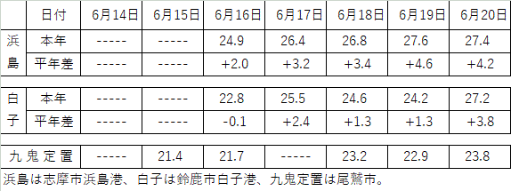 | 熊野灘周辺の概況 | 黒潮の蛇行北上部から熊野灘へ暖水が波及している。浮魚礁No.2は23℃台を観測。気温が上昇したこともあり、浜島定地水温は26.4℃で平年より約3℃高く、同日過去最高値を更新。定置ブイの表面水温は、片田、早田、阿田和で23〜24℃前後で推移。 |