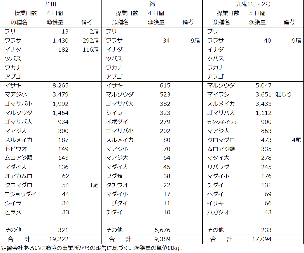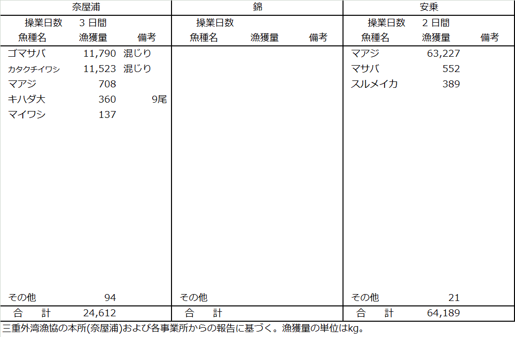 | 中型まき網 | マアジ64t、ゴマサバ12t、カタクチイワシ12t、マサバ0.6t、スルメイカ0.4t |