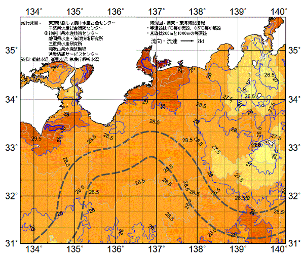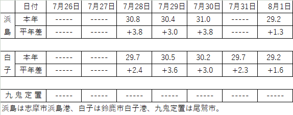 | 熊野灘周辺の概況 | 熊野灘沿岸の表面水温は平年より高めで経過している。熊野灘浮魚礁No.2は南西方向へ振られ、表面水温は29℃台前半で推移している。浜島定地水温は7/28〜7/30の観測において30℃〜31℃で推移し、平年より3〜4℃高く、3日連続で同日過去最高値を更新。 |