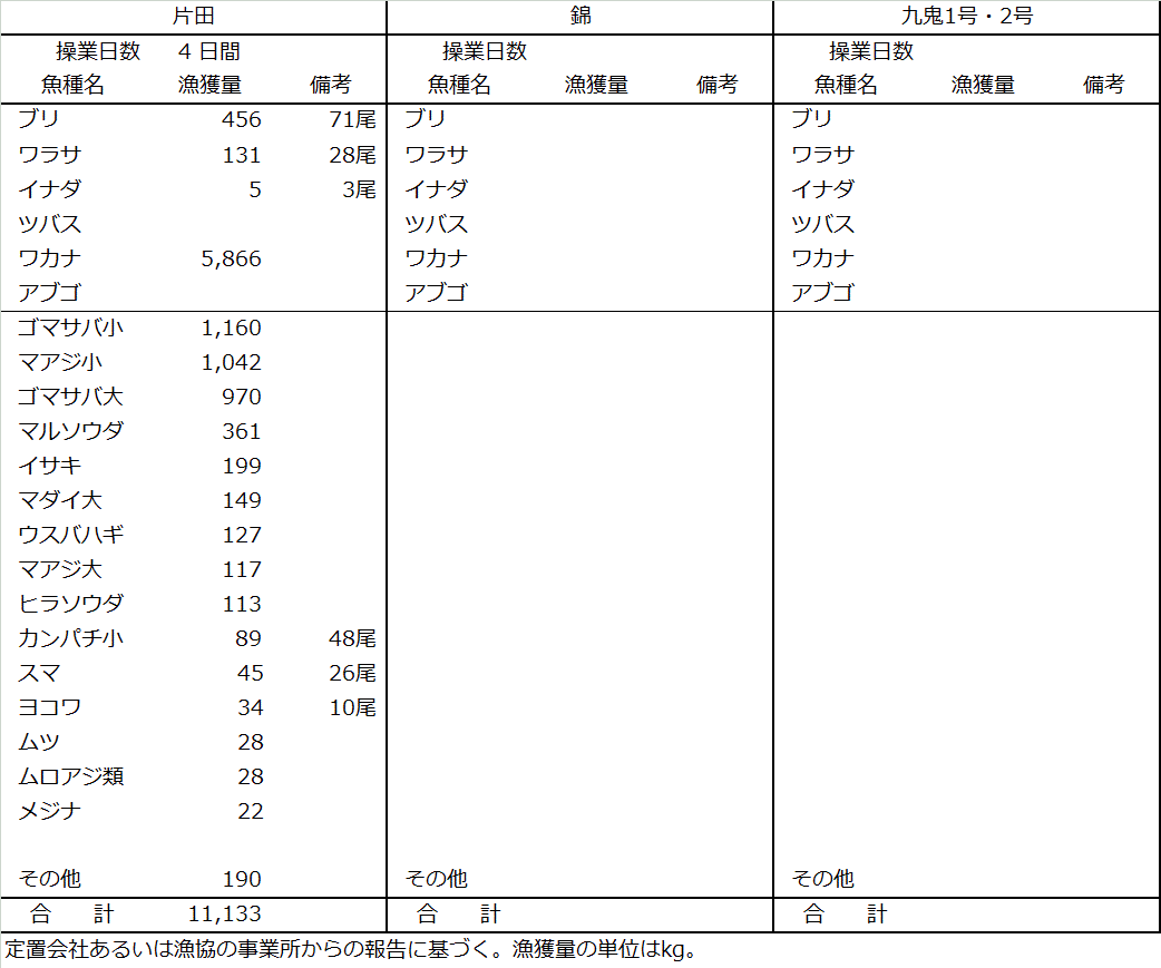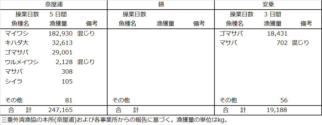 | 中型まき網 | マイワシ183t、ゴマサバ47t、キハダ33t、ウルメイワシ2.1t、マサバ1.0t |