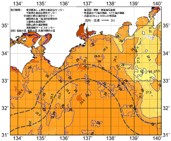 | 熊野灘周辺の概況 | 黒潮の本流から遠州灘に暖水が流入している。熊野灘沿岸の表面水温は、平年より高めで推移している。熊野灘浮魚礁No.2は南西方向へ振られ、表面水温は28℃台で推移している。 |
