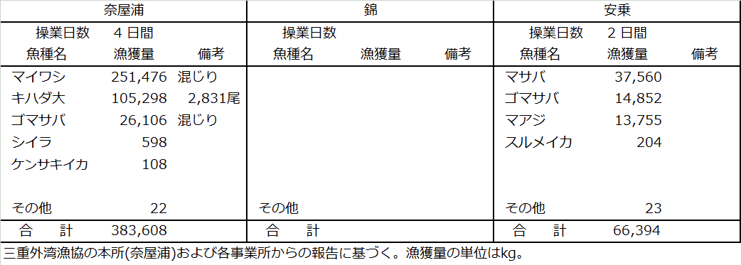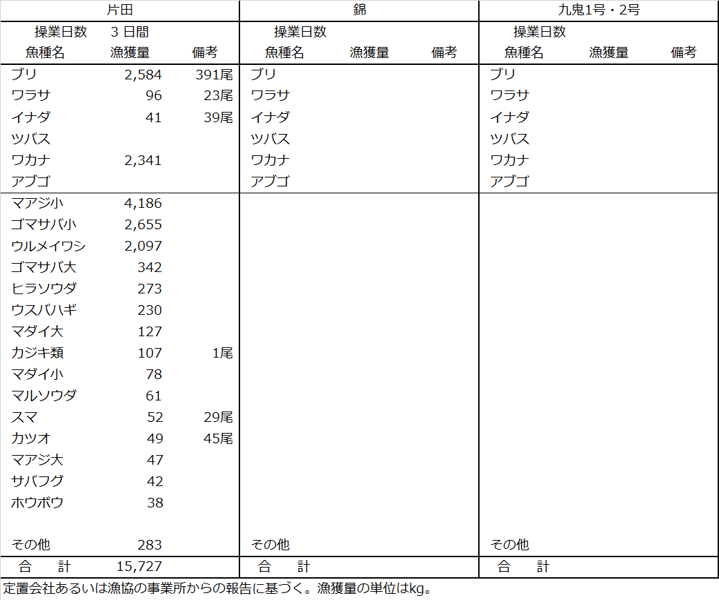 | 中型まき網 | マイワシ251t、キハダ105t、ゴマサバ41t、マサバ38t、マアジ14t |