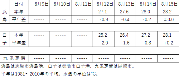 | 熊野灘周辺の概況 | 熊野灘沿岸では、沿岸湧昇の影響とみられる低水温が広い範囲で観測されている。片田定置ブイの1〜10mの水温は、8/13に一時20℃台まで低下し、現在は24〜25℃前後で推移している。 |